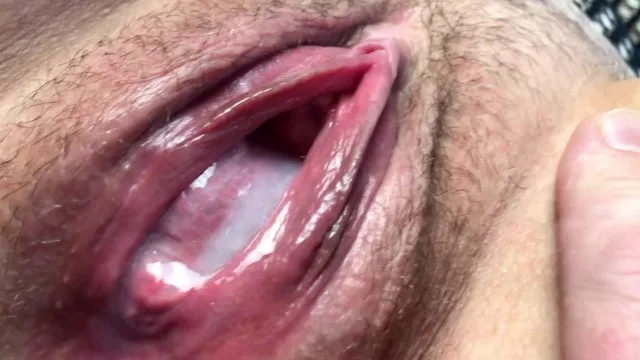 Cum flows from a meaty, swollen and fucked up pussy. Close-up.
