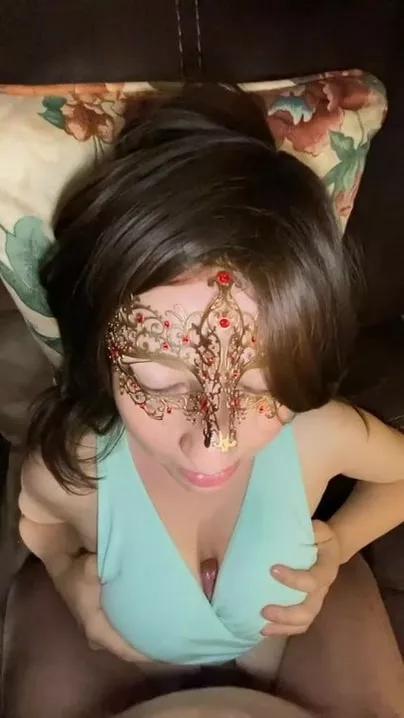Masked brunette gives clothed titty fucking