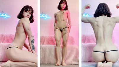 Petite cute Asian muscle girl in a micro thong flexes for you